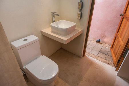 Se conforma por sala comedor y cocina en un mismo espacio, 2 habitaciones y dos baños completos (un baño con doble acceso), área oculta para servicio y un patio espectacular con una pequeña piscina de chukum.